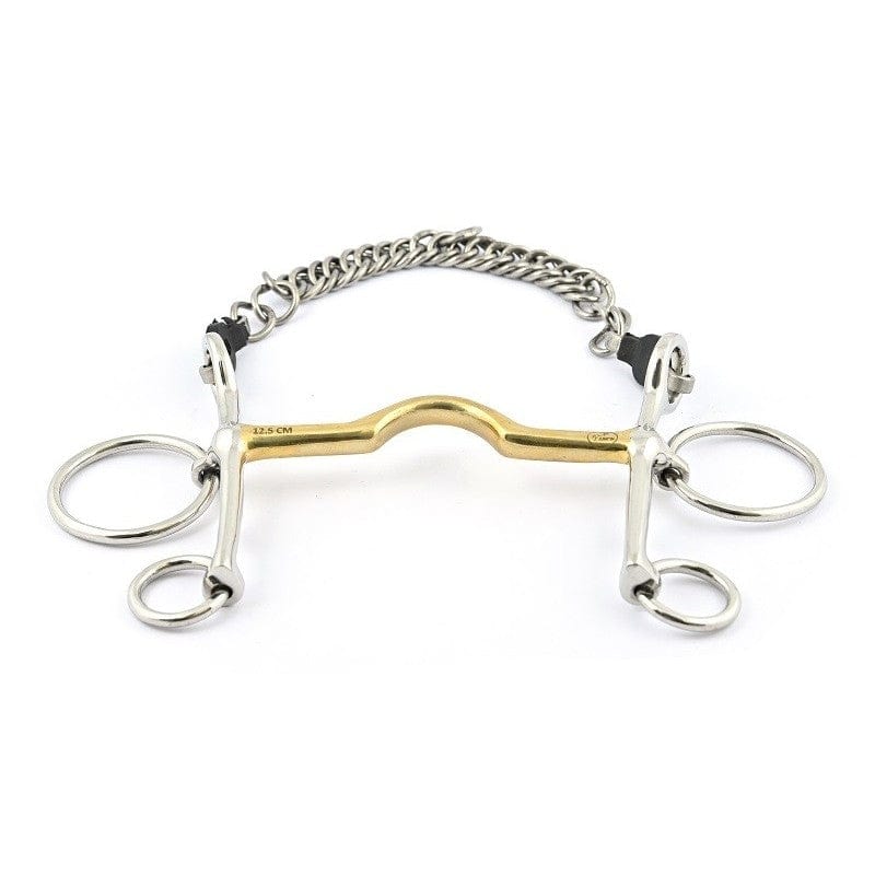 Tips: The particularity of this bit is the position of the rings, which gives a lot more action than a standard Pelham bit can give. The straight thin curb cannon gives better control to the rider. Every Pelham bit can be used directly with two reins, with bit loops, or with four reins. Therefore, the curb chain action can be softened by using other curb chain types as leather or nylon ones.