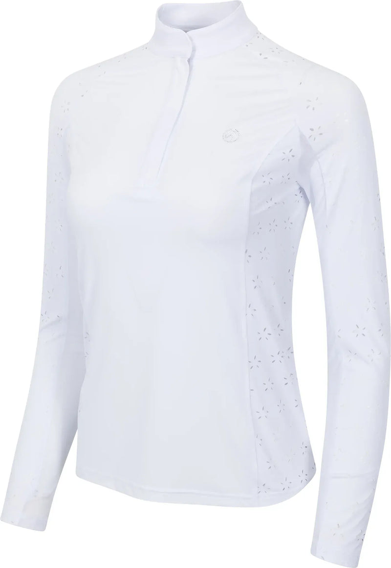 The SunPetal Long Sleeve white blend is effortlessly elegant with all-day performance. Crafted from our signature ProAir Fabric, this lightweight, breathable shirt is designed for ultimate comfort without sacrificing style. A versatile zip-and-snap collar allows for an easy transition from a modern schooling shirt to a classic, show-ring-ready look. Delicate floral cutout detailing along the sides and sleeves adds a feminine, elevated touch while maintaining a clean, polished silhouette. Perfect for the show ring or everyday riding.