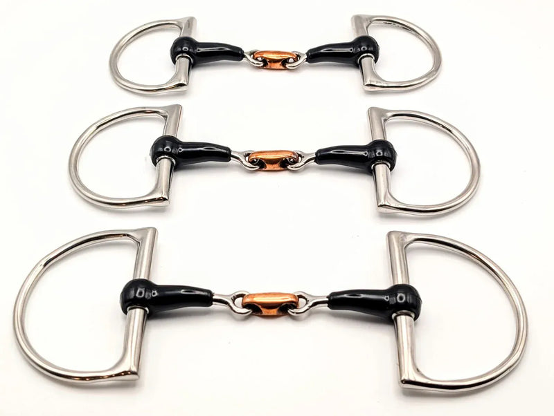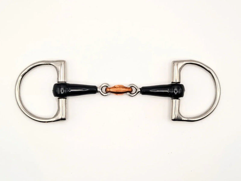 This bit features a soft-feel TPU mouthpiece paired with a double-jointed copper oval link center. The TPU offers the comfort of traditional rubber with greater durability and mouth safety, while the copper link encourages salivation and a more accepting contact. The D ring cheeks keep the bit steady and help prevent pinching, making it a solid choice for ponies needing a soft, consistent feel.