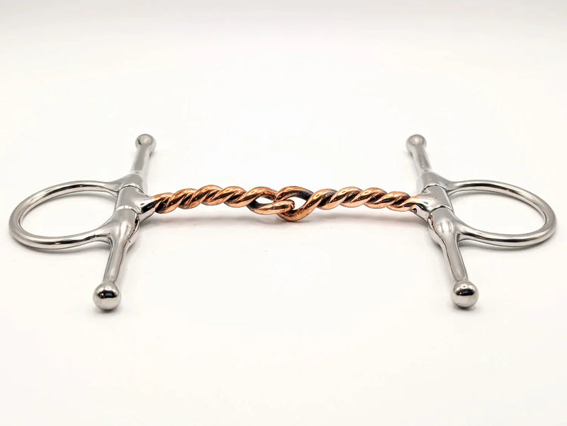 This bit features a single twisted copper wire mouthpiece paired with full cheeks for enhanced lateral guidance and a more defined feel. The twisted wire encourages a quicker response to rein aids, while the copper promotes salivation and a softer mouth. Best suited for educated ponies and riders needing just a bit more precision. Sized and balanced specifically for pony mouths.