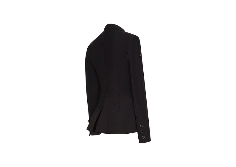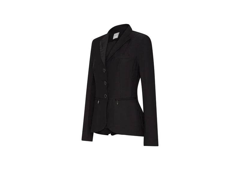 The Victorine competition jacket is designed to provide comfort and technical performance to riders. The tailored fit and asymmetrical cut (front is cut shorter than the back) ensure a perfect fit, elegance, and comfort. The Victorine is made of a highly breathable technical fabric that brings an excellent fit, freedom of movement, lightness, and durability for optimal comfort. The jacket guarantees UV protection thanks to the special construction of the fabric, which offers also protects against ultraviolet rays. The Victorine inner lining is made with high-stretch fabric and mesh to guarantee breathability and the highest freedom of movement. The jacket is embellished with details such as a Swarovski® Samshield blazon on a sleeve, genuine Alcantara® elements, and Swarovski® crystals on the cuffs. The pocket on the chest brings originality and distinctiveness.